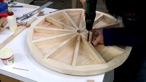 After the glue dried, I drilled the four holes through the spokes all the way