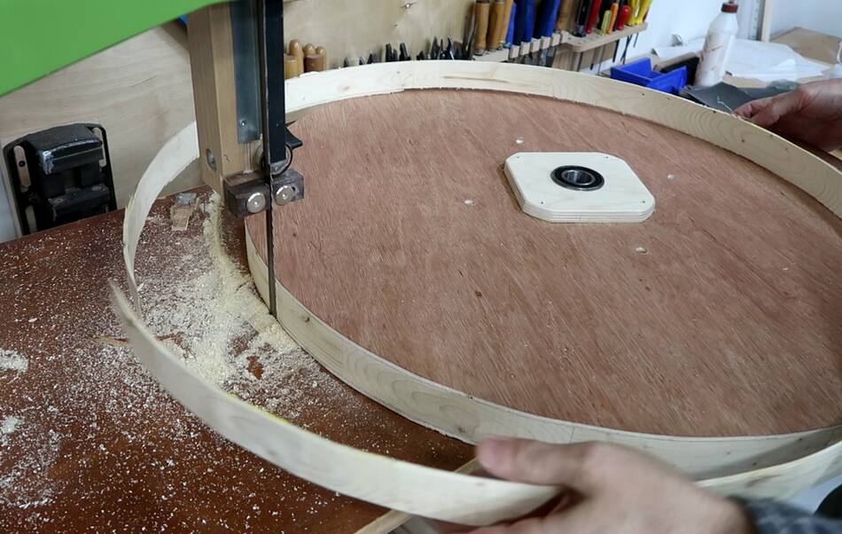 So for the next wheel, I cut off about 4 mm with the bandsaw before turning it.