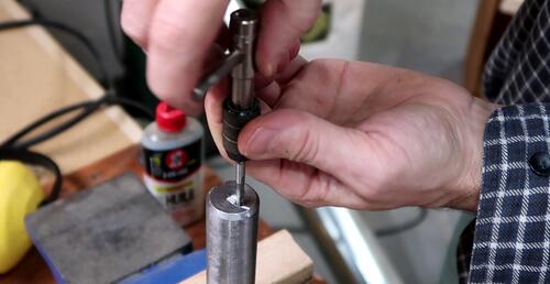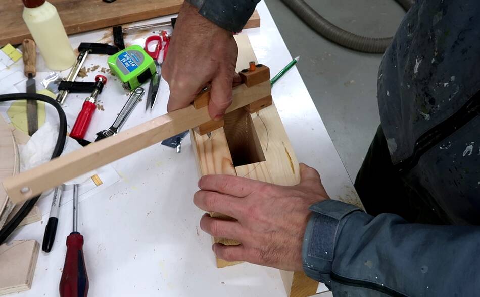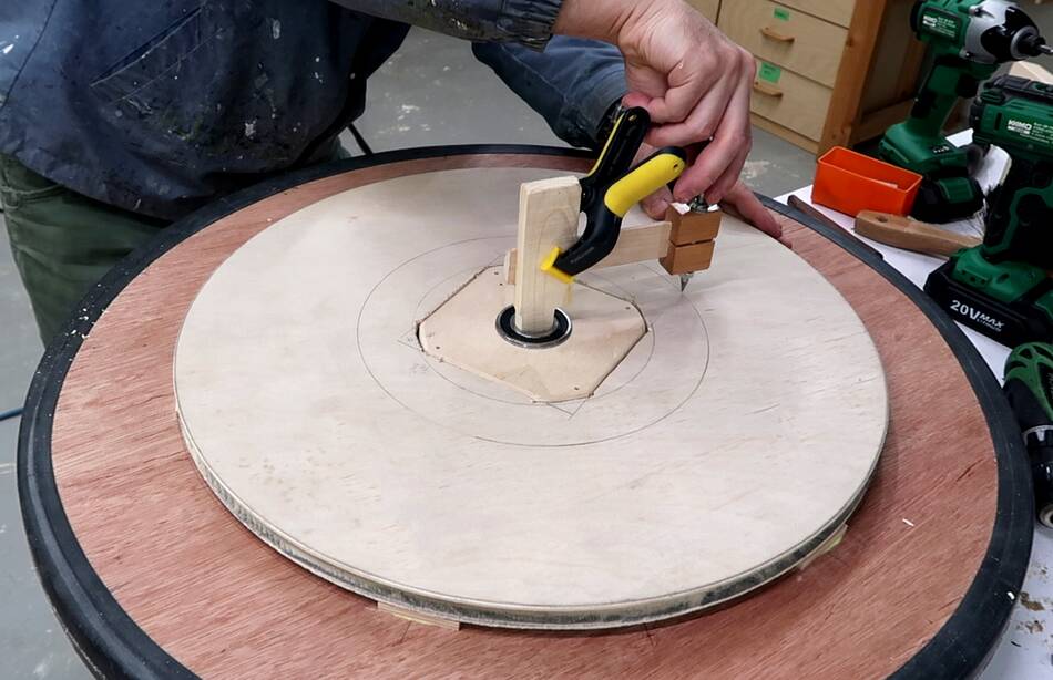 ... and clamping part of my beam compass to a piece of wood stuck in the bearing