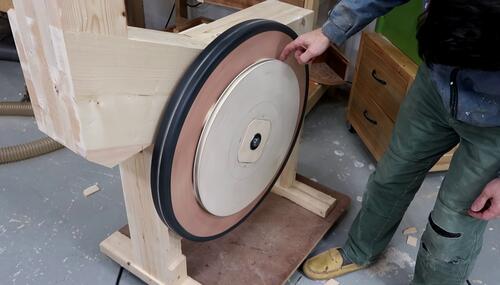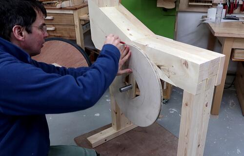 I made a piece of wood to fit in the middle of my big pulley so I could hold it against the frame and mark how much of a cut-out I had to make for it.