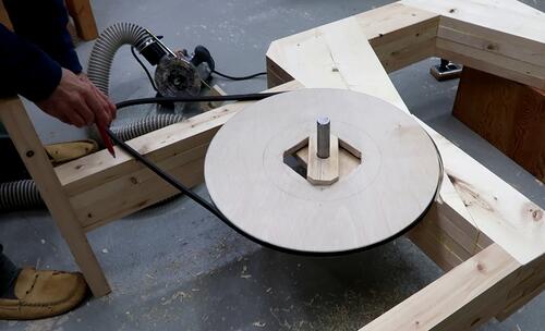 Once I was satisfied it was centered, I screwed it on with 12 #8 screws. The pulley doesn't get that much force on it, but the belt pulls it back and forth all the time. More screws ensure that it doesn't get wiggled loose over time.