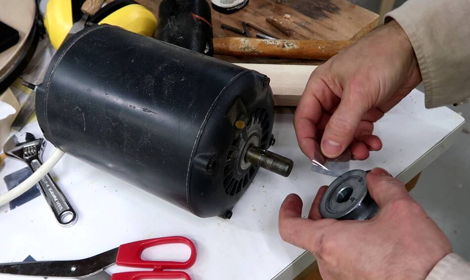 I'm using a piece of anti-static bag as a shim to make sure the pulley will have a tight fit on the shaft. These set screws on the pulleys can't be counted on to not come loose over time. In fact, that bandsaw that this motor came from became unusable because the set screws weren't enough to hold them tight, and the hole in the pulley had worn so large from this that it was no longer usable.