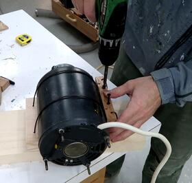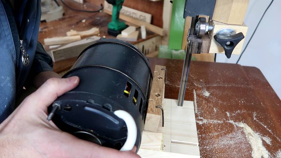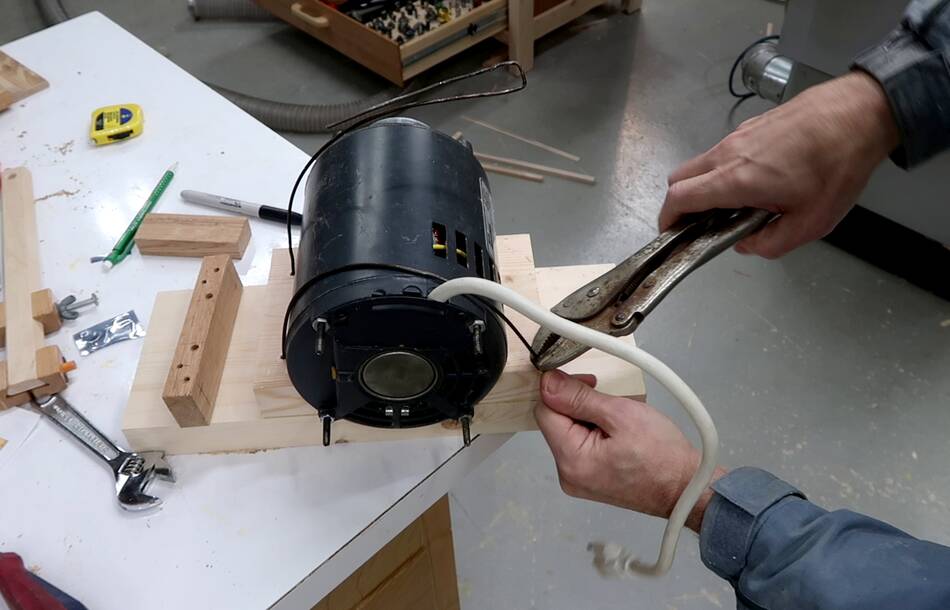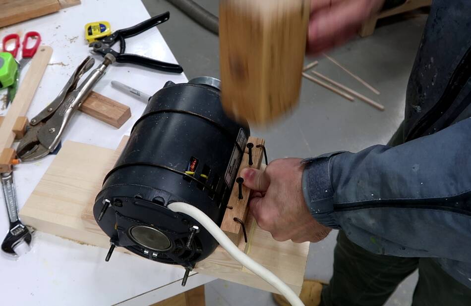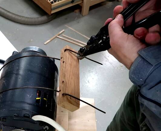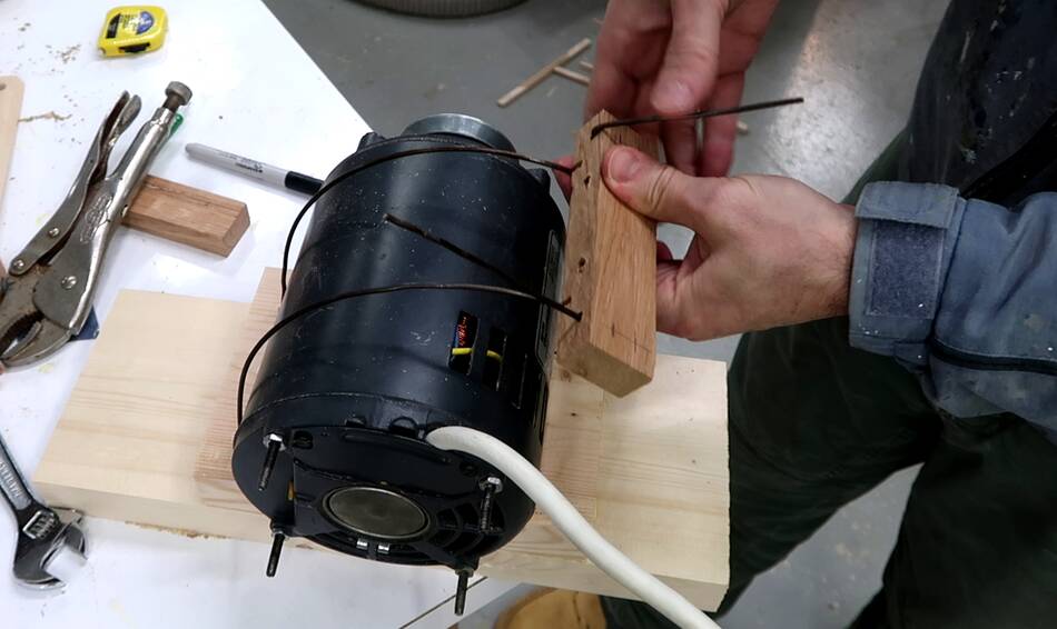 the block down, so that the coat hanger wires pull tight around the motor.