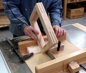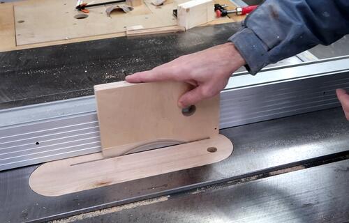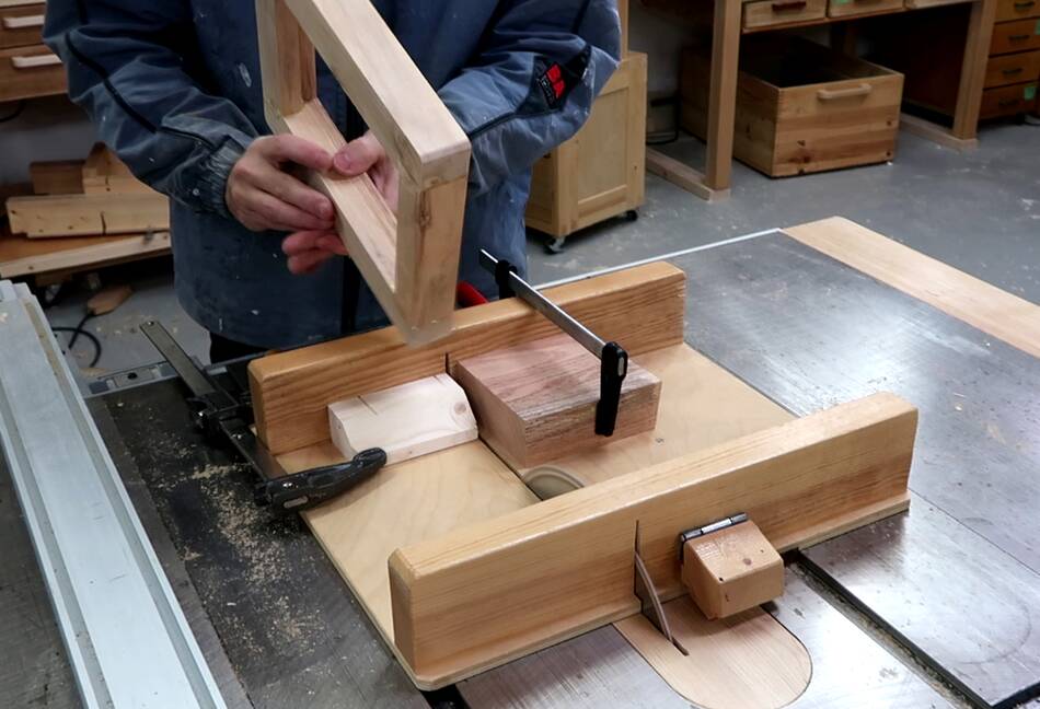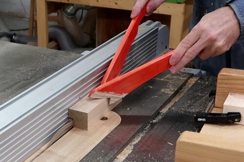 Some people make special jigs for cutting splines, but I just use my table saw sled, with a block clamped on the left to help place the workpiece at 45 degrees, and another block on the other side to set the lateral position.