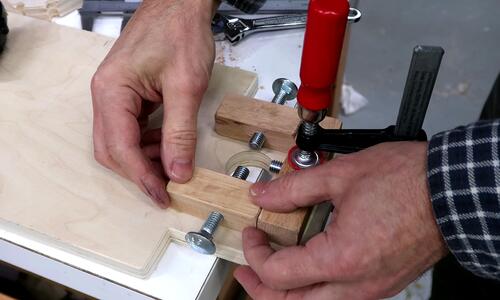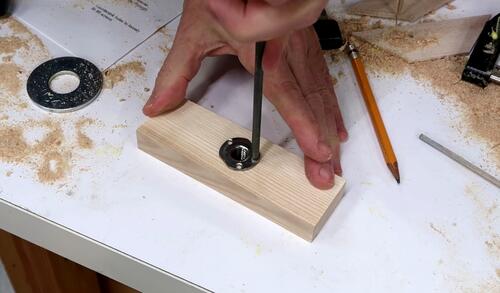 Adding a 3/8" T-nut to a piece of hardwood to go on the top of the bracket.