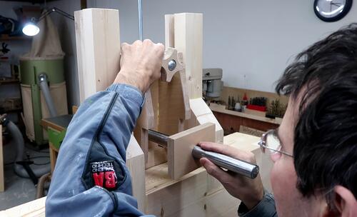 I set the lower axle in place, using a clamp to force it aligned perpendicular