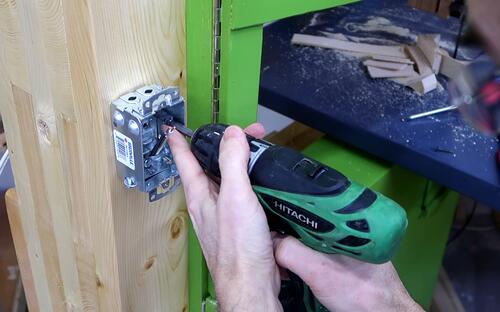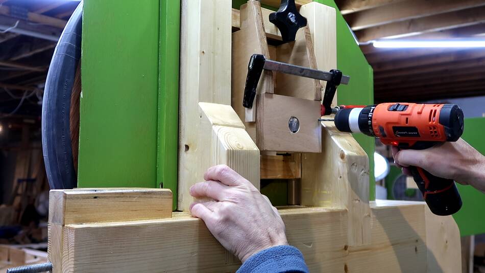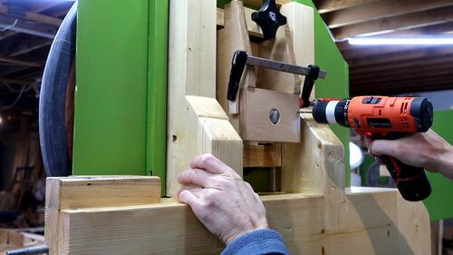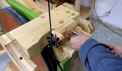 Screwing on the rear mount for the lower axle. On my 20" bandsaw I glued this but that is perhaps overkill. And if this one were to slip slightly, I could always adjust the screws that position the back end of the axle.