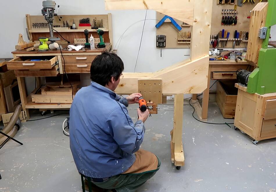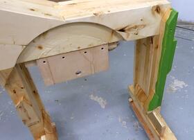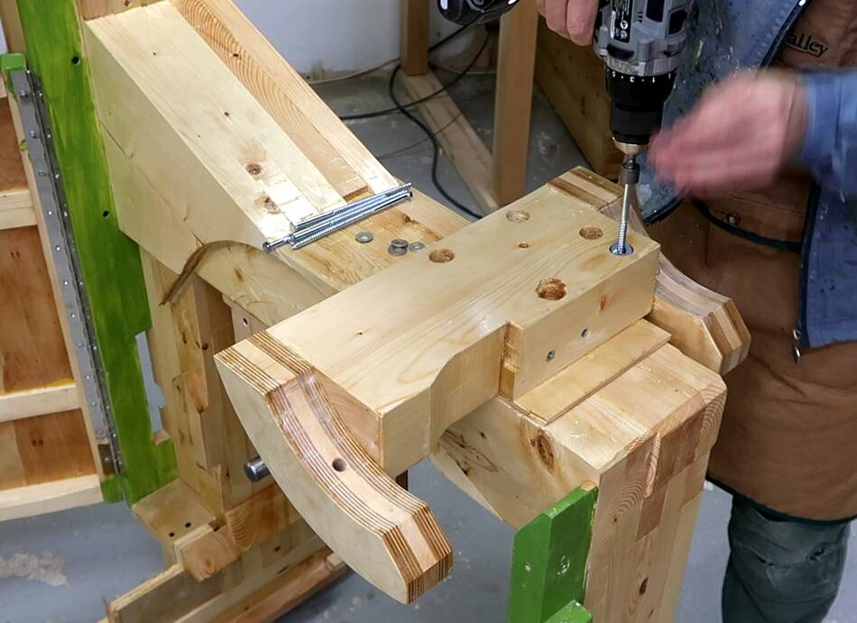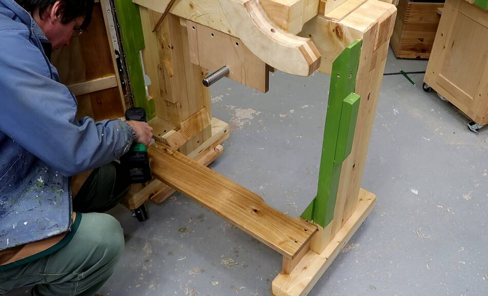 6" long 1/4" wood screws with washers hold the lower trunnion support beam.