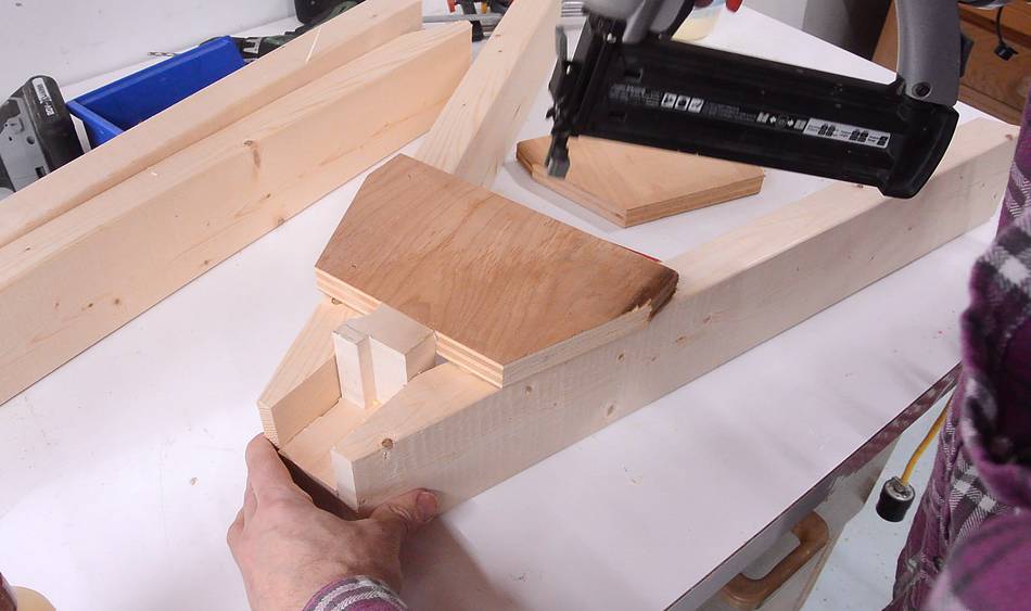 I made a spacer to get the legs the right distance apart as I nailed on the gussets.