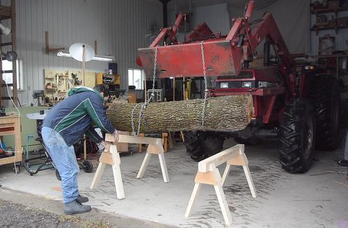 assembled the sawhorses under the log, lowered the log, then backed the tractor into the
