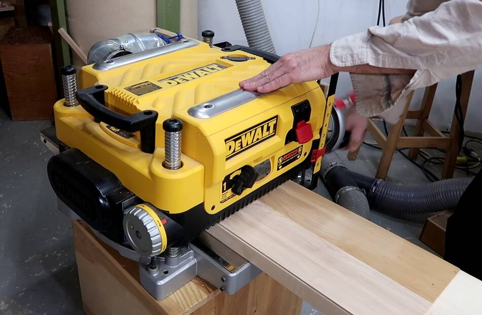 Also, to avoid having the front of the boards catch the planer head, I started the planer with the start already past the cutter head. On my first attempt the planer kicked back the wood as it started. So I had to start it with the head raised slightly so it wouldn't engage the wood as it spun up. Once started, I had to crank it down to the actual thickness. This meant the start of my "boards" didn't get planed, so I had to repeat this step feeding the wood in the opposite direction to plane the other end.
