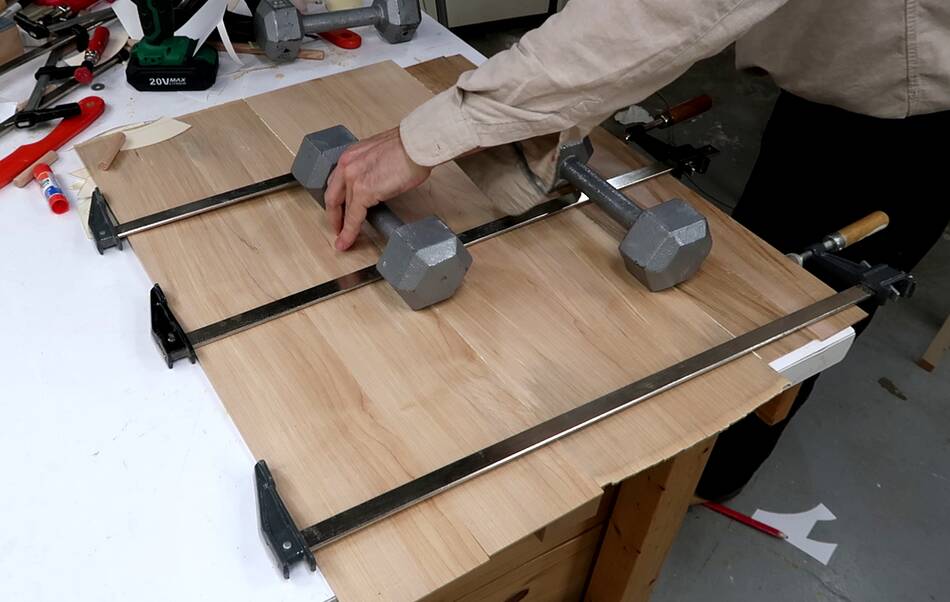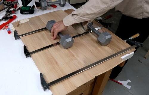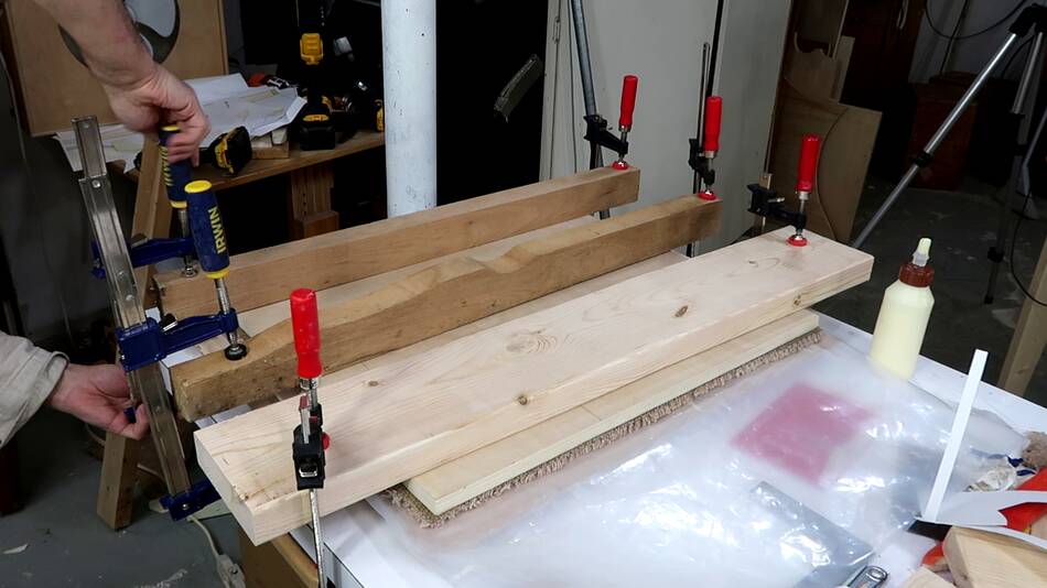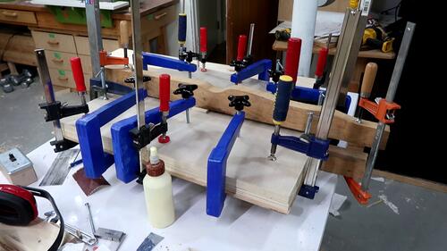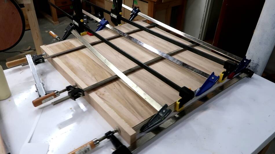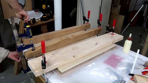 Then pressing the sandwich firmly together with some clamping cauls, clamped