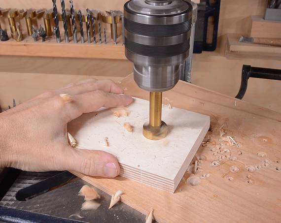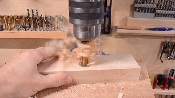 As I drilled this hole, for every 1 cm of depth drilled I rotated the block 180 degrees about the vertical axis. When drilling big holes, a lot of force is involved, and the drill press table tends to flex downwards. So even if the table is perfectly square when you check it, it won't be while drilling. But by rotating the piece 180 degrees for every cm of depth, this angle error cancels out.
