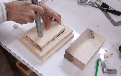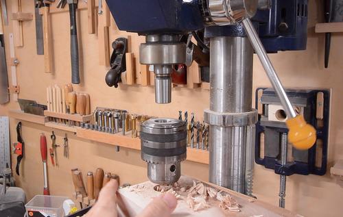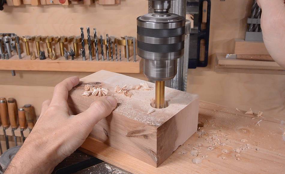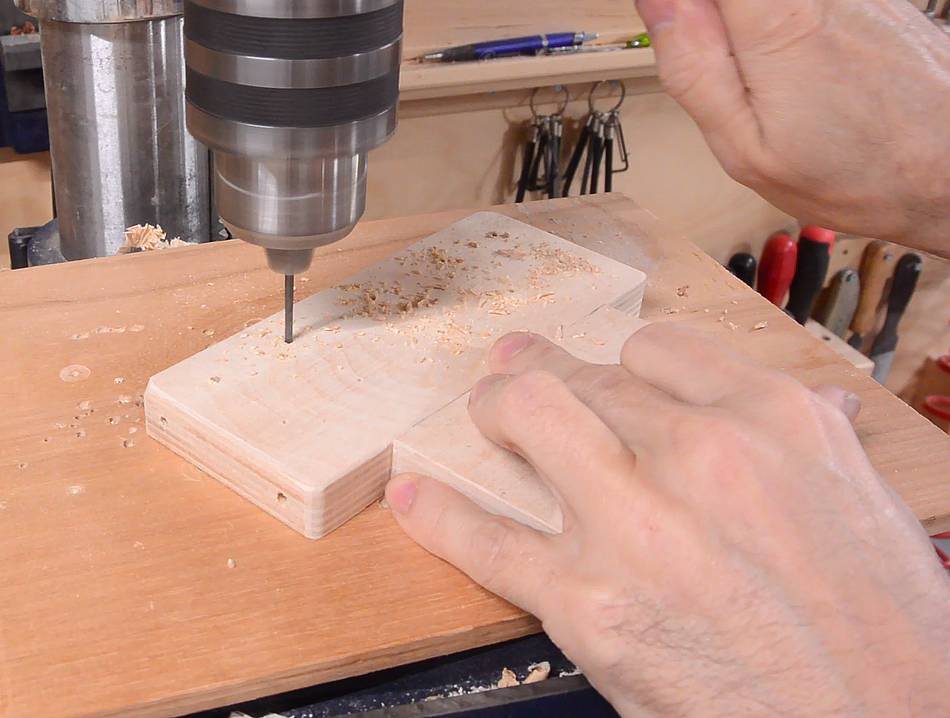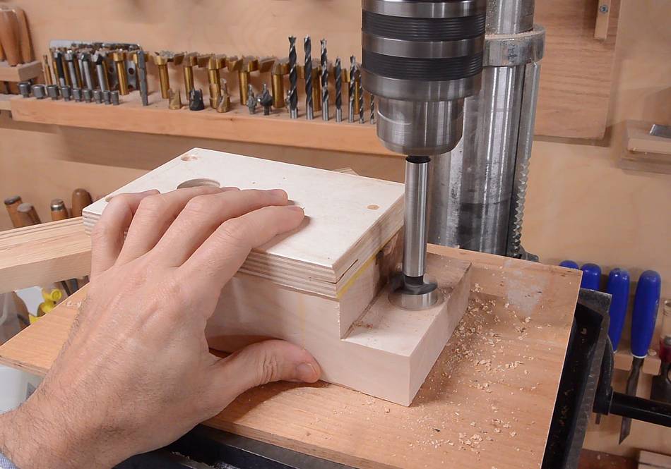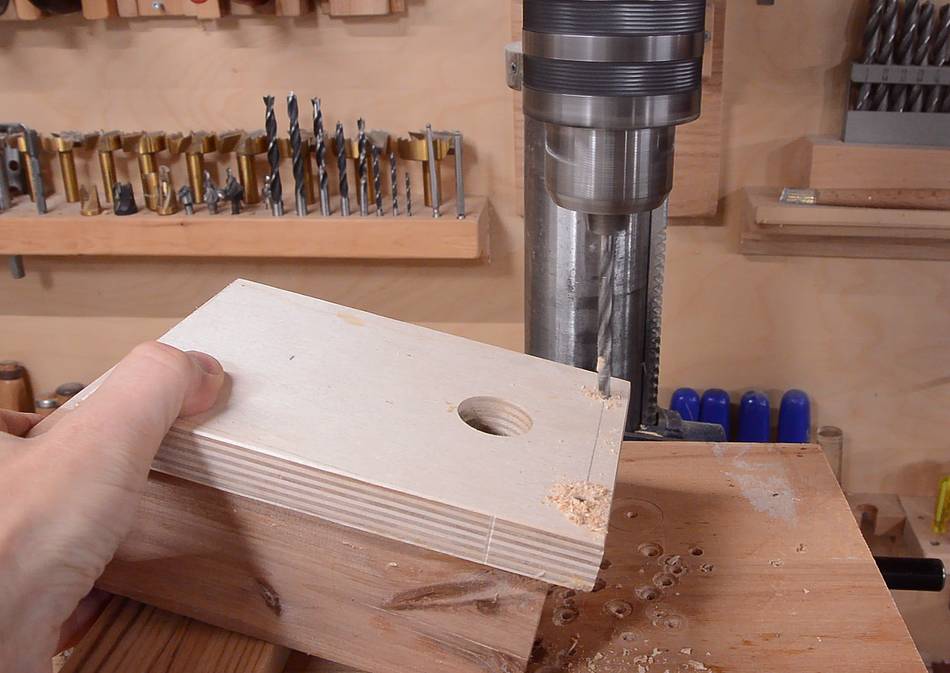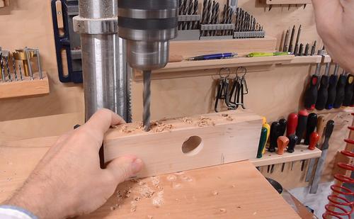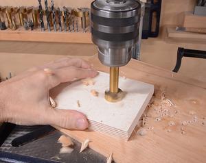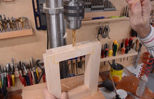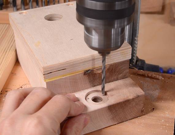 A block of hardwood goes behind this, here drilling the hole in that.