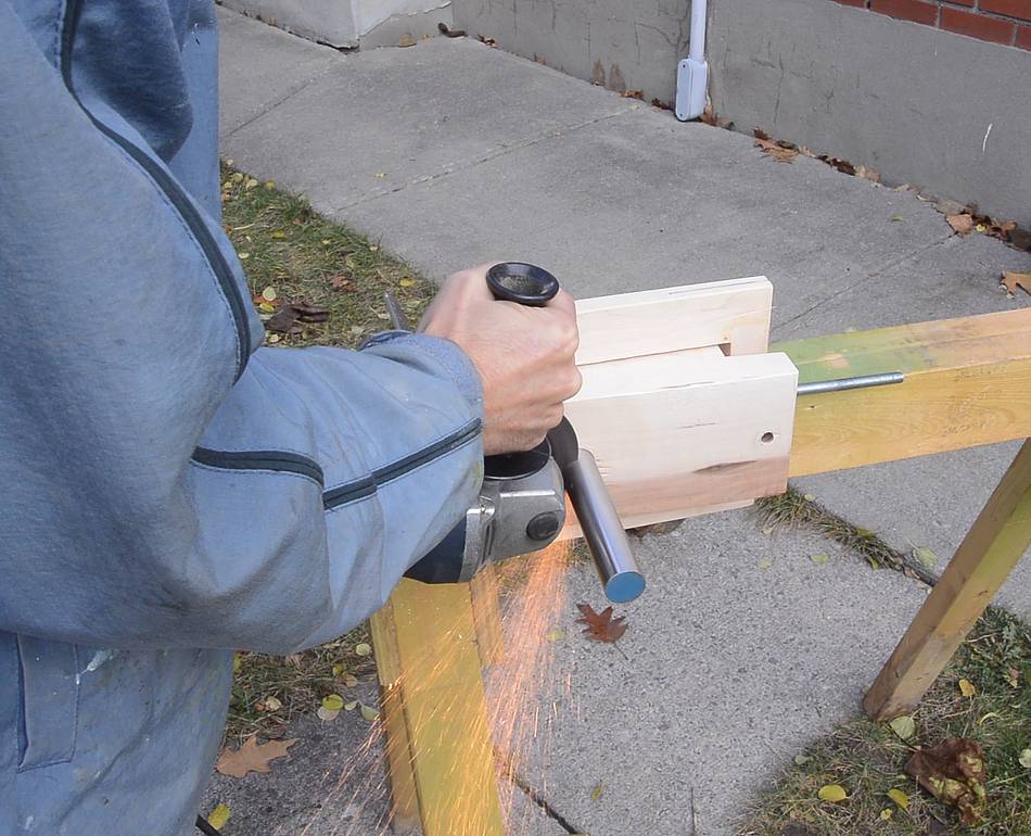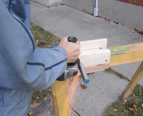 With the shaft as tight in the block as it was, I figured it was easier to cut it off while clamped in place. I'm cutting it off with a thin cut-off disk in the angle grinder. More on cutting metal with an angle grinder here