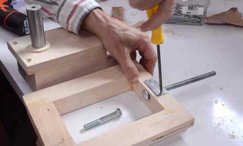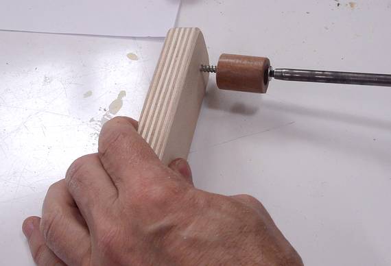 A small piece of dowel screwed onto the other end of the piece of plywood forms
