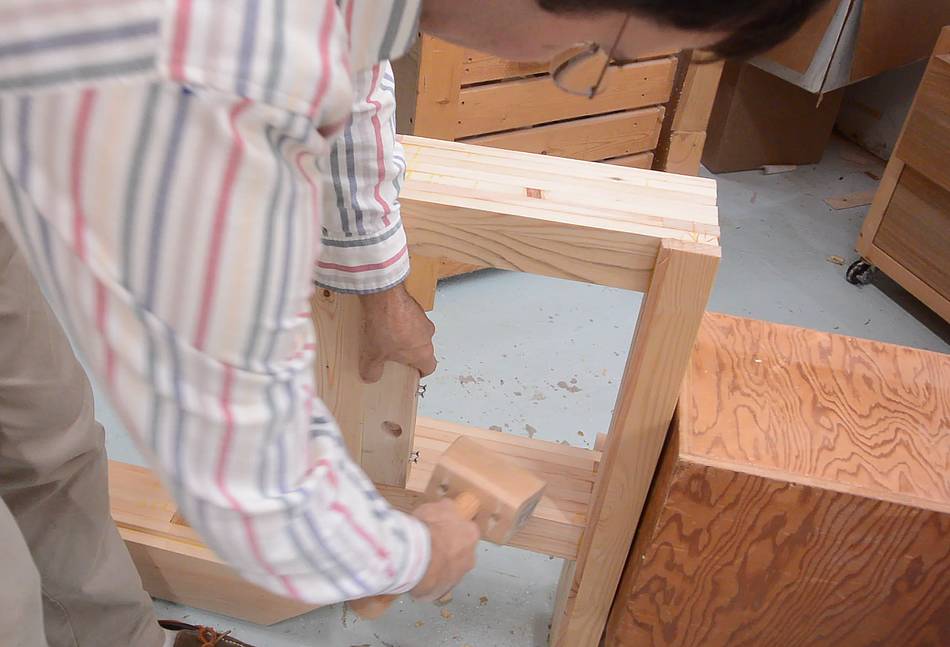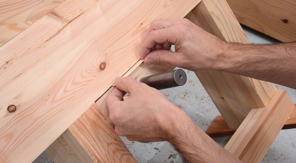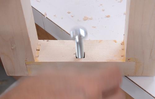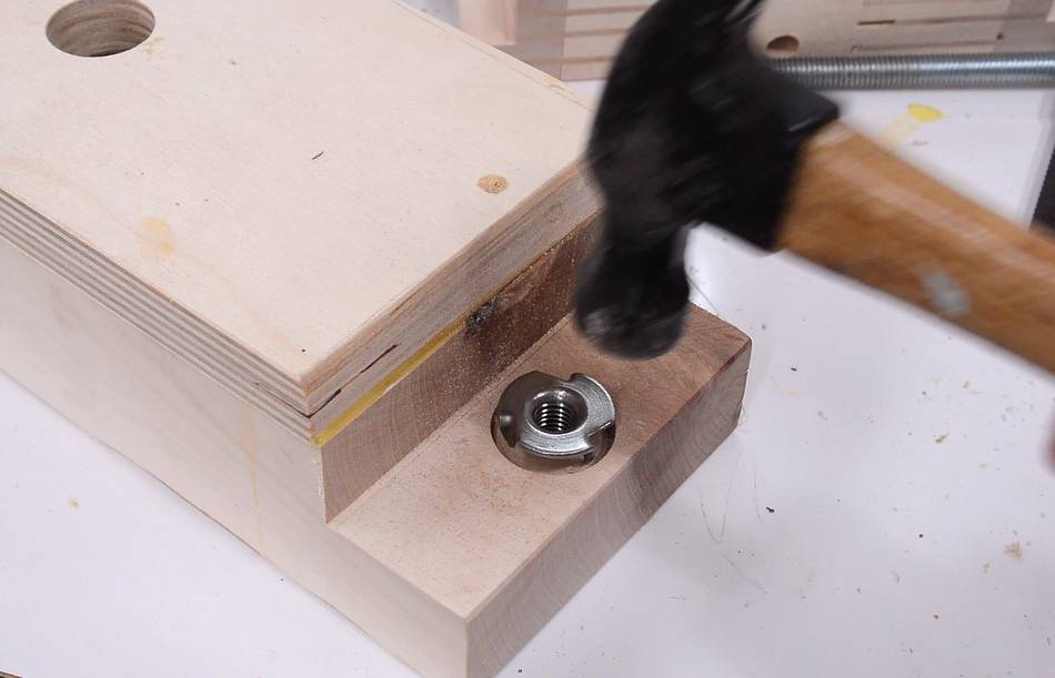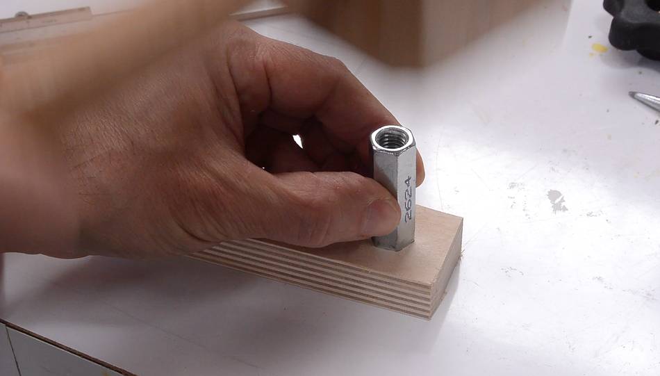 Tapping the T-nut in place to mark where holes for the prongs need to go,