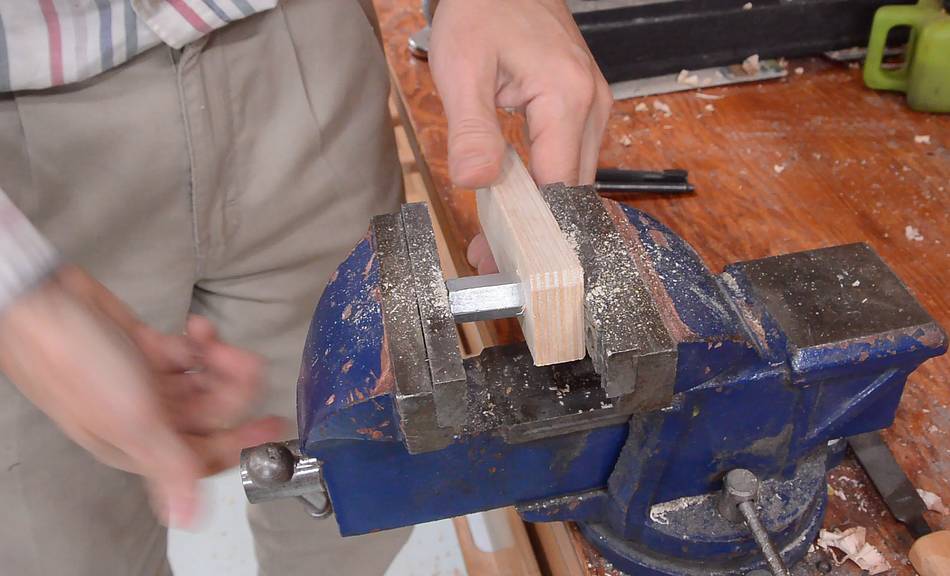 with a block of wood in it to hold the workpiece at 45°. I checked