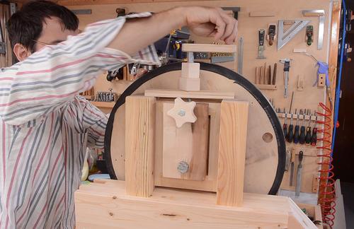 Installing the crank on the saw. Note the two blocks to bring the crank up high