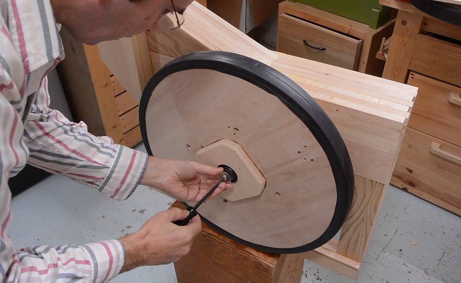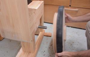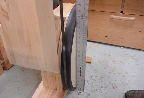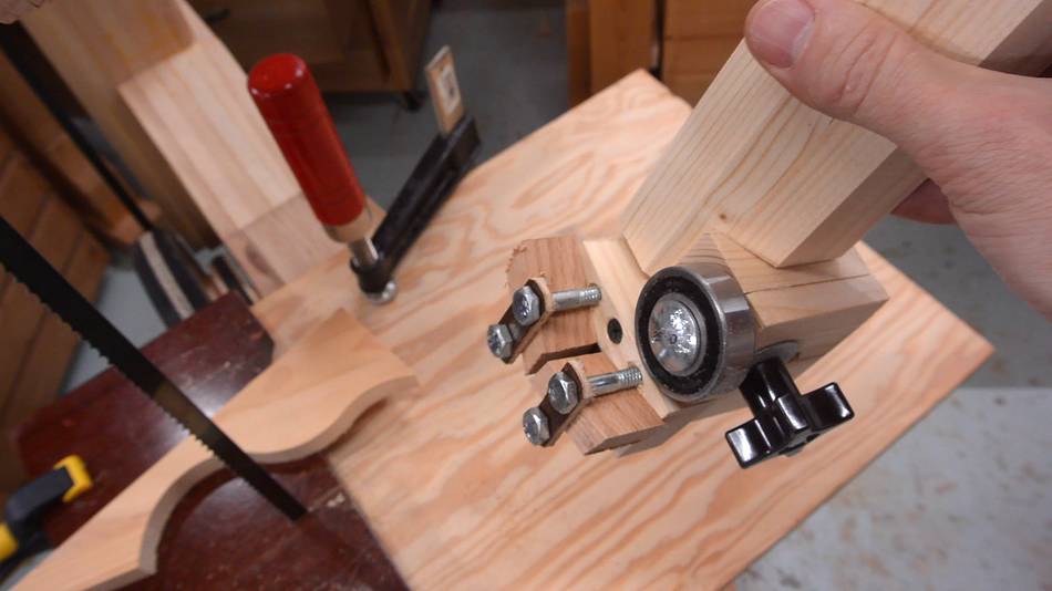 A small wooden spacer goes behind the lower wheel to keep it from rubbing