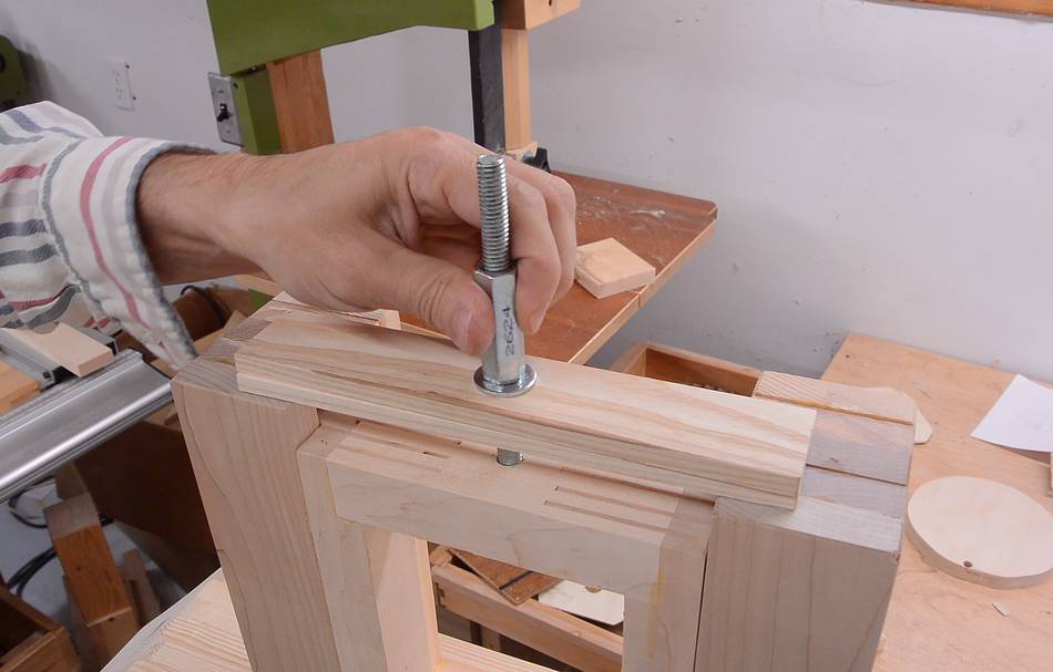 I drilled the pilot holes in the plywood a bit large to leave the screws a little loose so it can pivot. Once blade tension is applied, the block is pushed down against the frame, and pulled back by the tracking adjust knob, so the screws are mostly there to keep it from falling out when there is no blade tension.