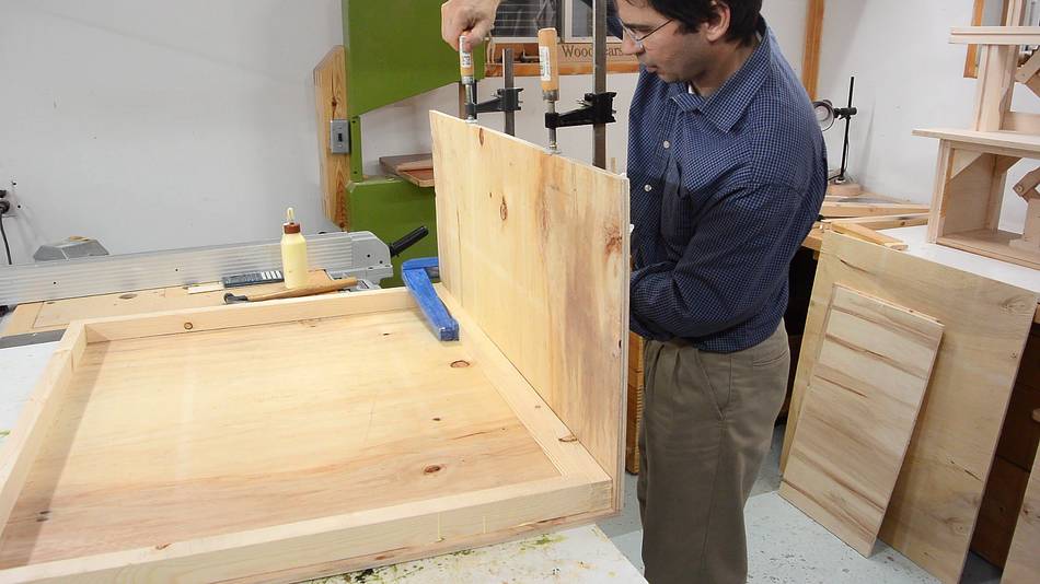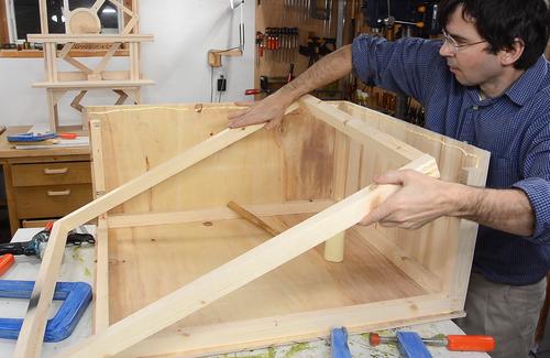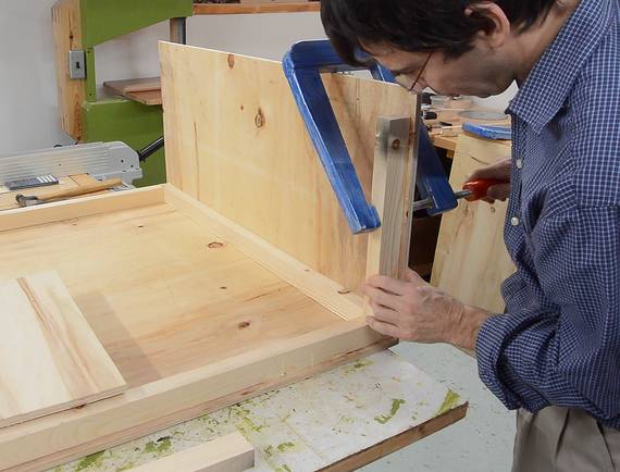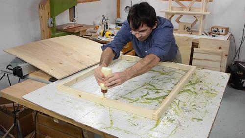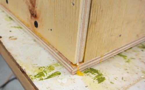 Then applying glue to the edge and the piece of wood to go on the side.