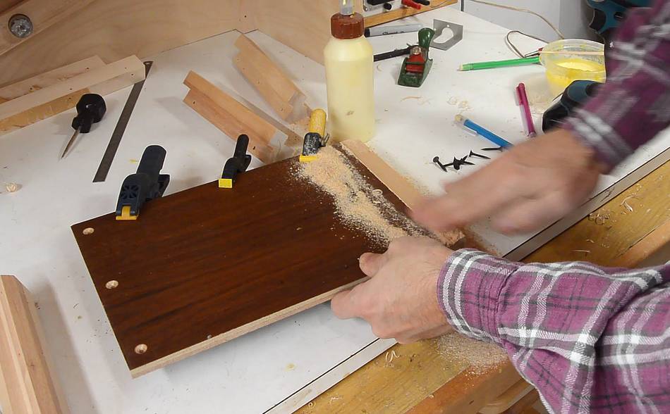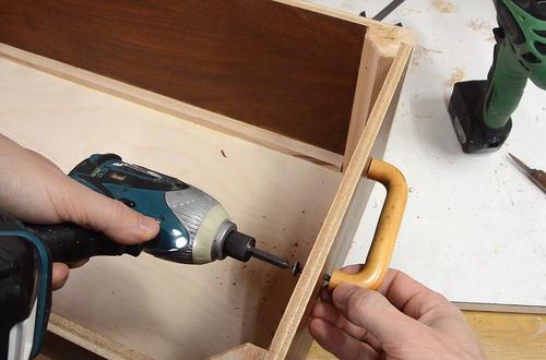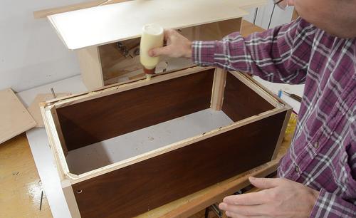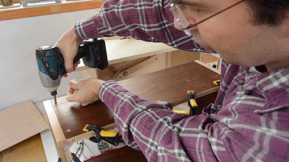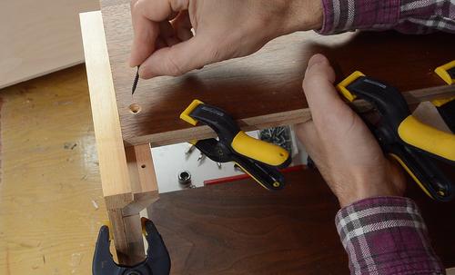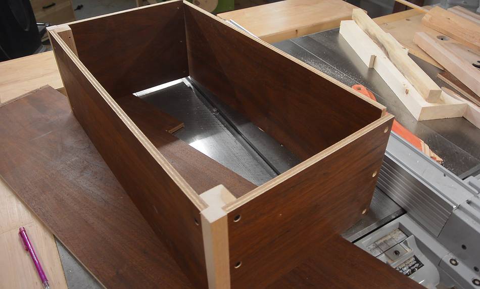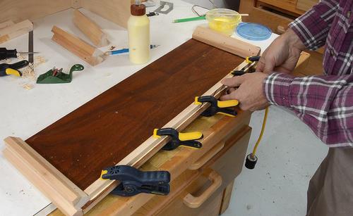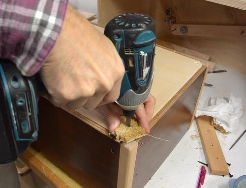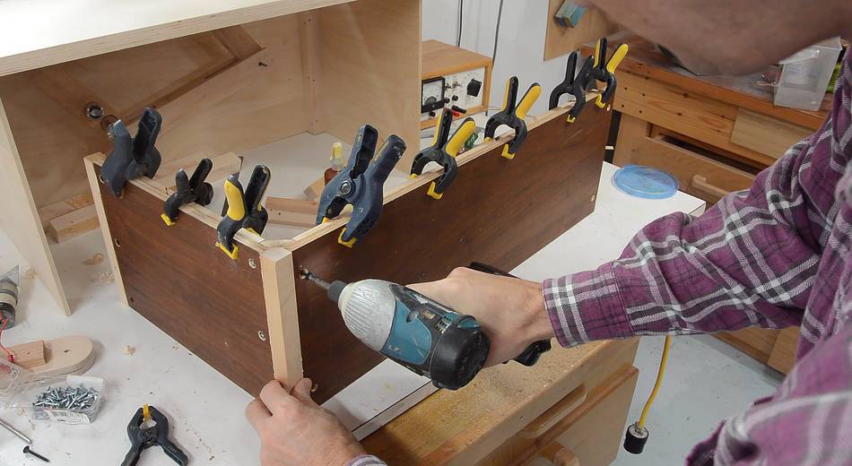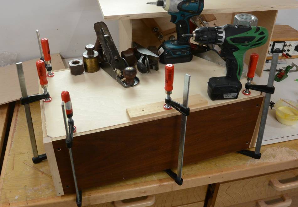 Screwing together the box while the glue for the rails is still drying.