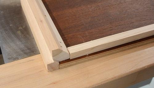 The corners are cut from square pieces of hardwood (maple) to have two rabbets