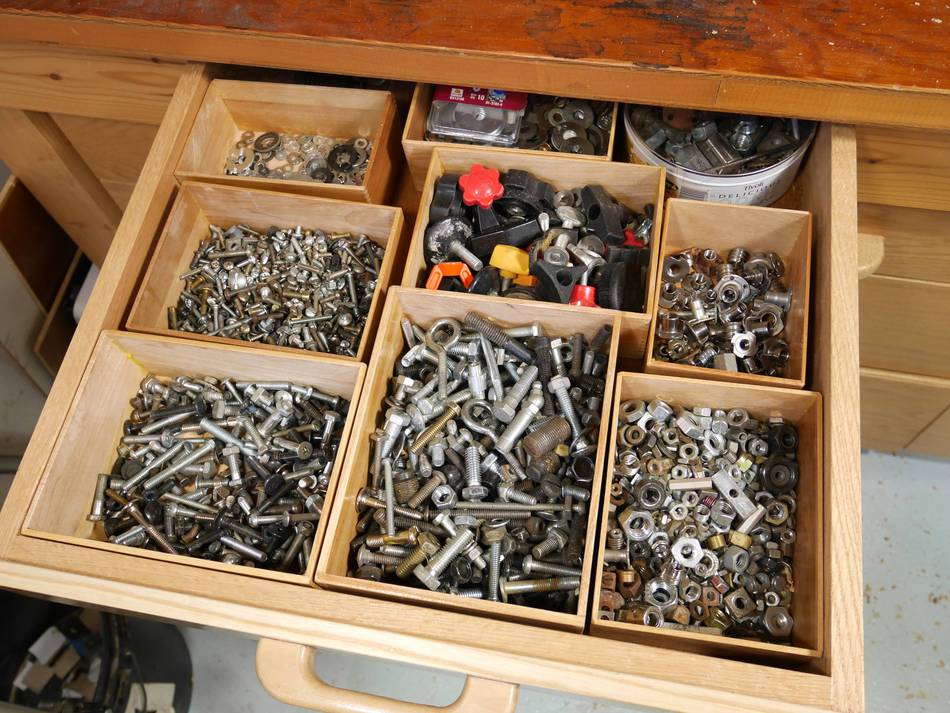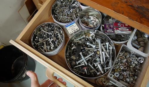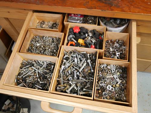 I keep machine screws in round tin cans in this drawer. But the cans were