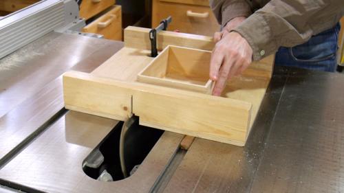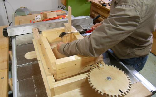 I'm using my old small table saw sled, which has a wide slot in the bottom from having cut dadoes with it. I clamped a board on the right side to act as a stop just above the blade. Pushing the box against the stop positions it so the blade flush trims the corner.