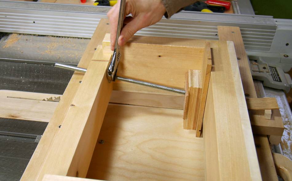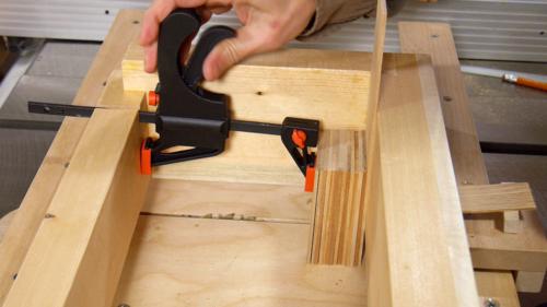 I used a small quick-grip style clamp configured as a spreader clamp to hold the pieces into the box. I cut a slot into the back of the jig to let me get the clamp further down. It seemed an elegant solution.