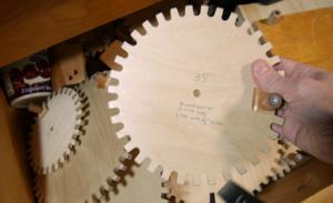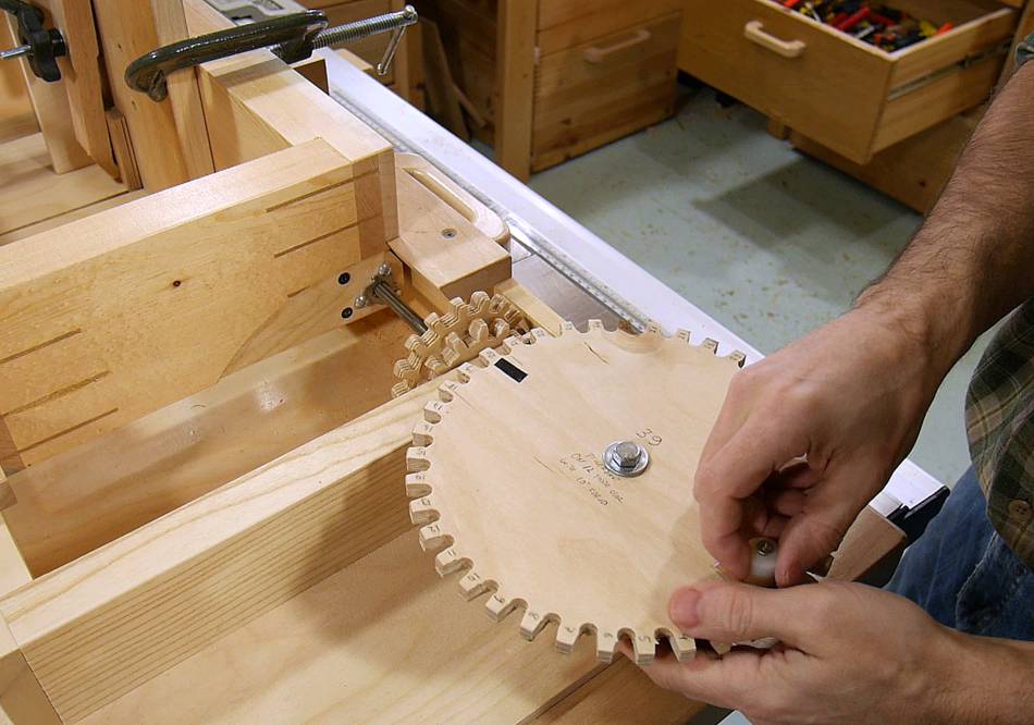 With the thin kerf blade I use most of the time, meshing a 39-tooth crank gear against the 12-tooth secondary gear (on the 16 TPI threaded rod) produces just the right spacing.
