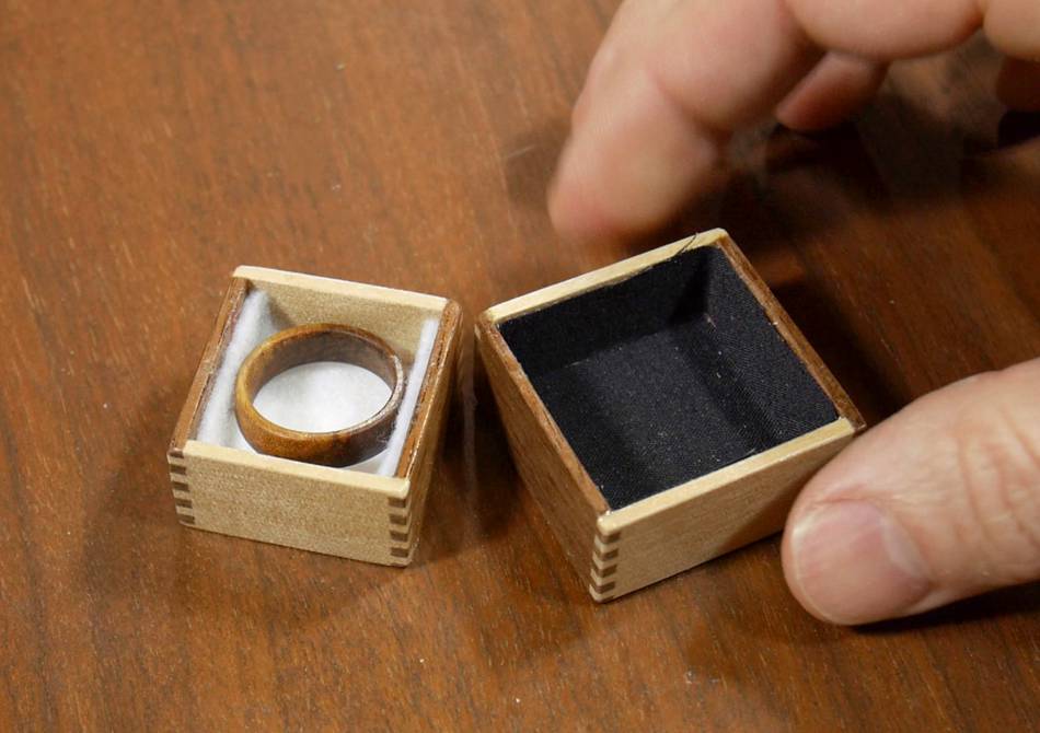 Except the whole thing is a bit belated. We actually got married last year. When I mentioned to Rachel that I wanted to see how tiny a box I could make, she had the idea of making it so the ring could go into it.