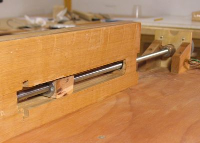 out section where a nut on a threaded rod pulls the front board back and forth.