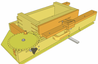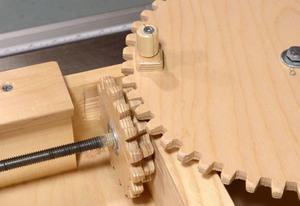 The jig uses wooden gears and a threaded rod to reposition the stock. Moving to the