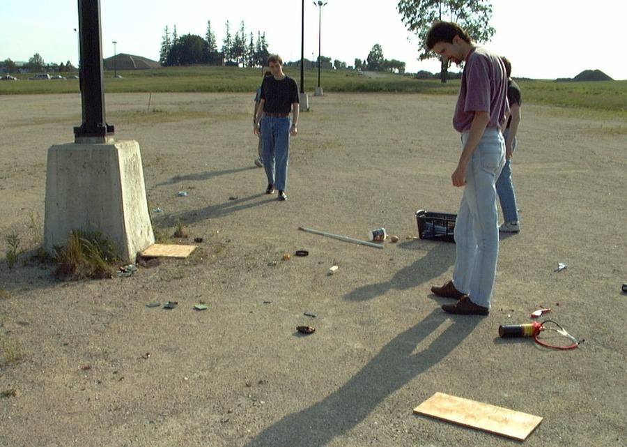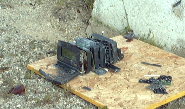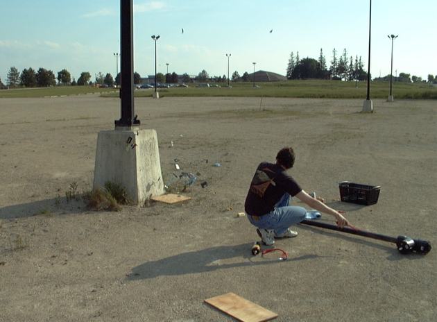 The product had caused us much grief during development, so destroying some by shooting a cannon at them felt right. Note the propane cylinder for fuelling the cannon in the photo. The cannon is fired by igniting the gas with a spark plug. Ron is using a barbecue lighter to create the spark.