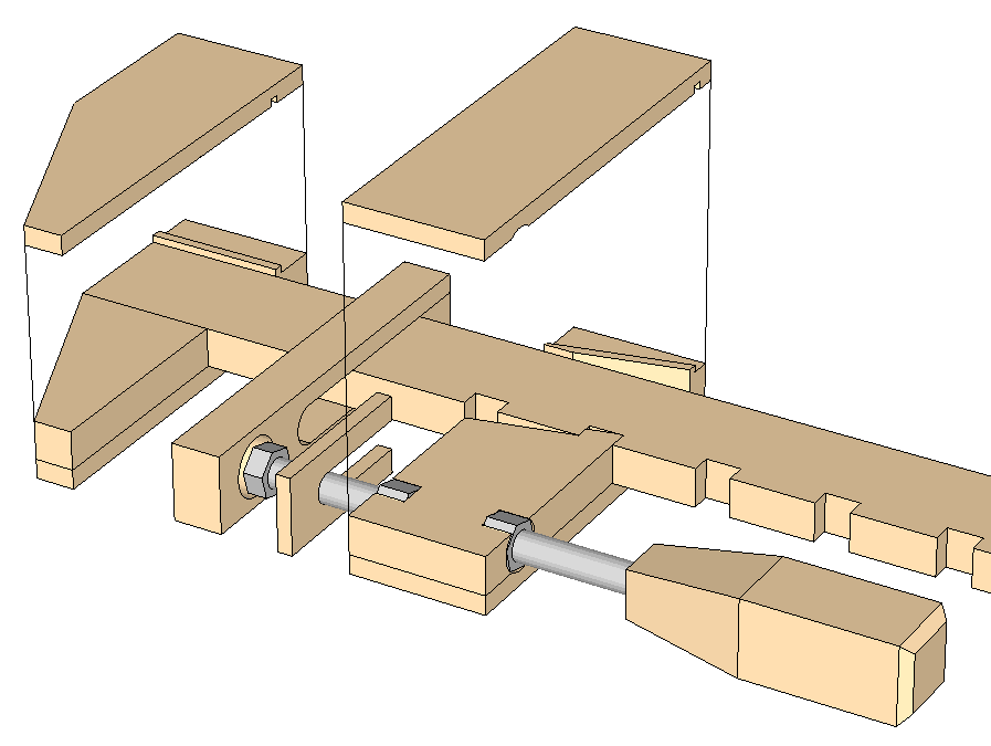 "Attached is the SketchUp model I did during the final stages of construction, mainly to work out some of the details. The small dadoes in the side pieces of the head and screw stock are not only for added strength, they are very important for alignment - setting the screw stock to the correct angle and the head at 90 degrees. The slots may be closer together but that increases the risk of fracture, especially if dropped. I first considered saw tooth notches but settled on these as easier to cut accurately. "