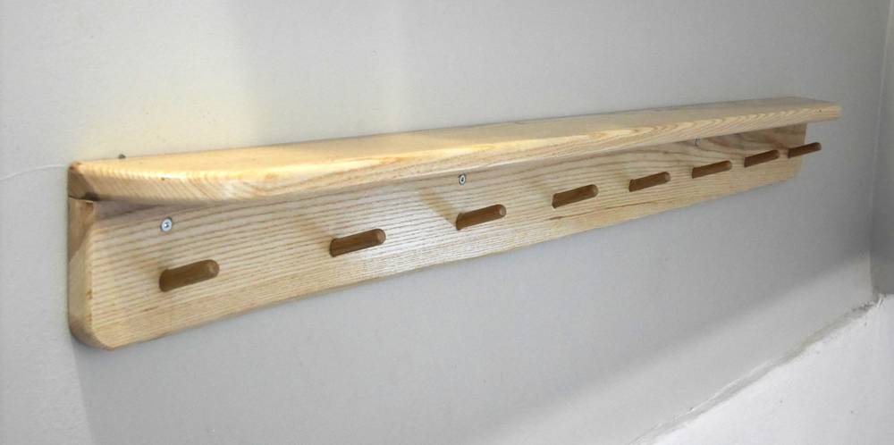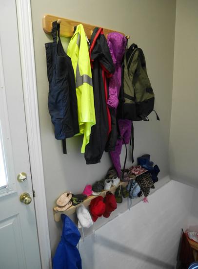 The coat hooks consist of a board with dowels in it, with another board