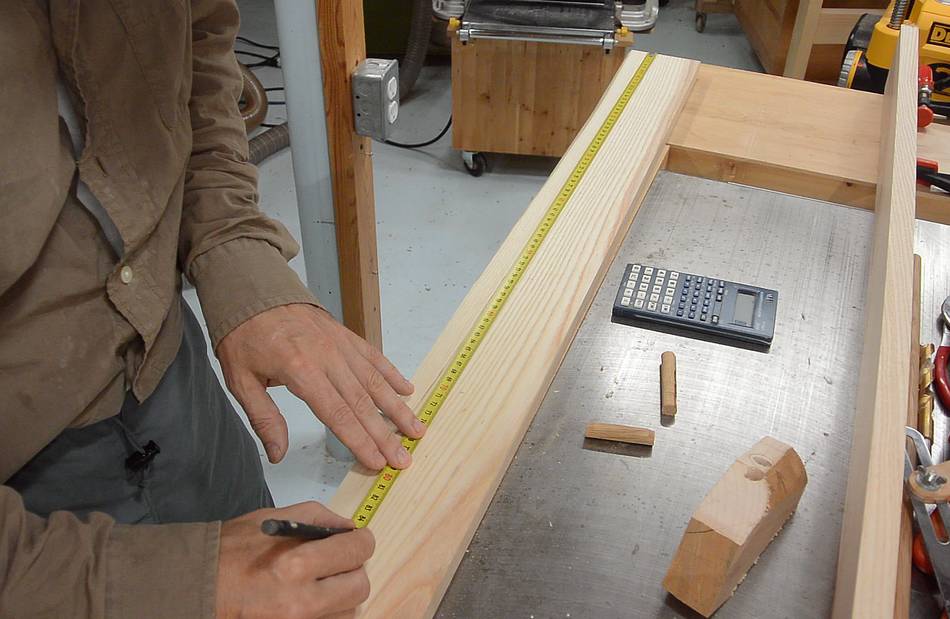 I start by carefully measuring along both boards for where the dowels will be.