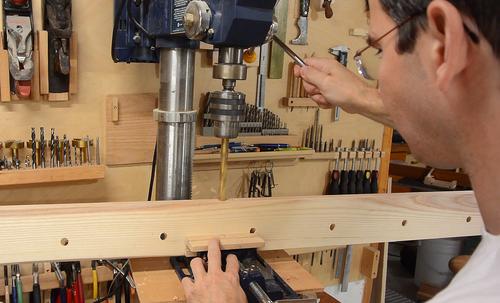 Drilling mounting holes in the shelf. I put them right behind the pegs to hide