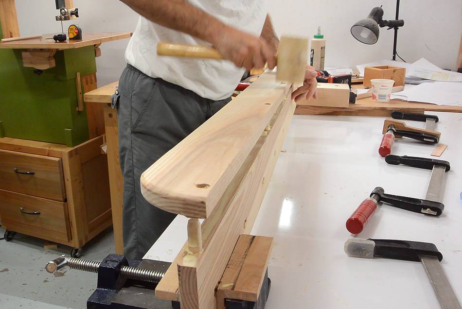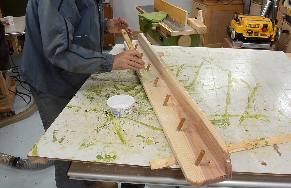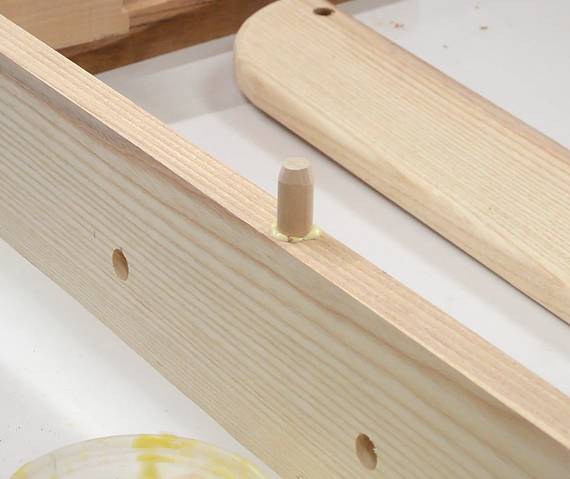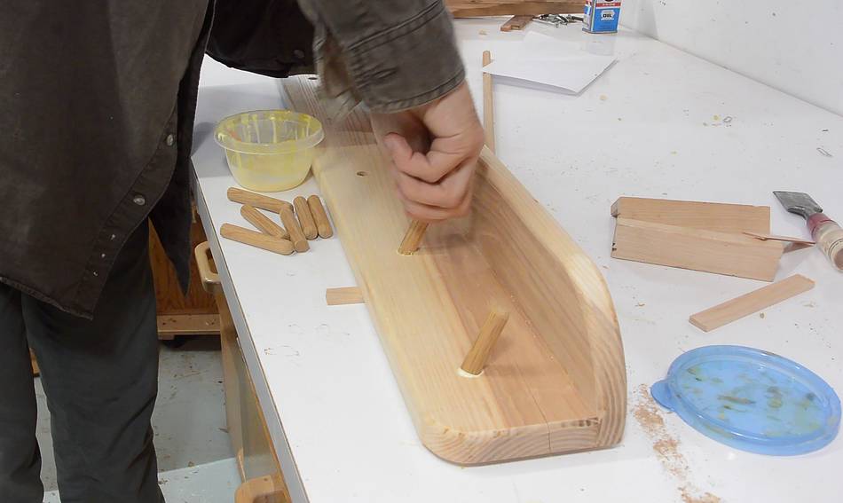 Gluing in the dowels. I put the board on top of a spacer to allow