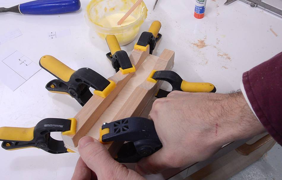 of dowel to help line up the holes, then applied clamps. Then, before the glue