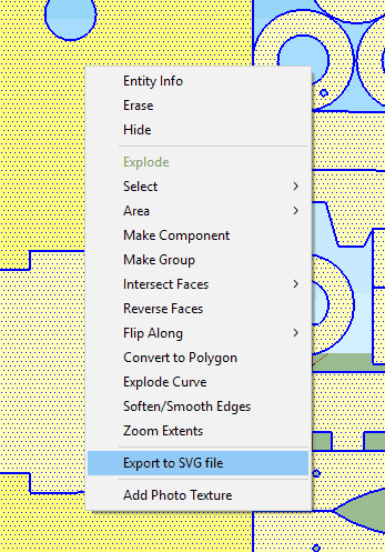 It's necessary to select all the surfaces that you want to export at once, so the next thing I did was to "explode" all the objects. Because they were touching, they all joined together. You can verify that objects are joined by triple-clicking in SketchUp. Everything that touches gets selected together.