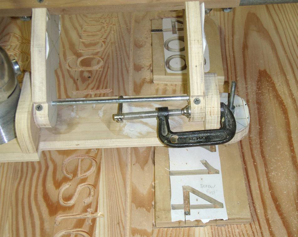 The actual routing is the easy part. It is painstaking scrolling out all the lettering templates, but it is worth it as the sign is being routed front and back. Notice how I clamped the carriage near the follower. This really helped me get a consistent trace, more like I was using your pantograph. I also clamped the panel flat to a carpenter's level because my shop has wood heat. Going from 20 degrees F to 70, the larch wants to cup a little in places.