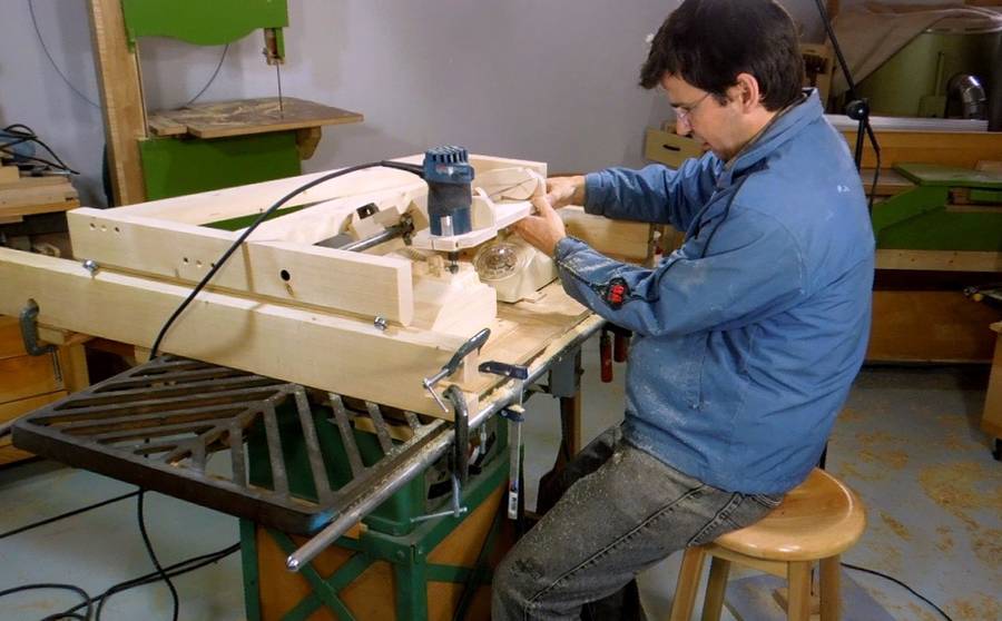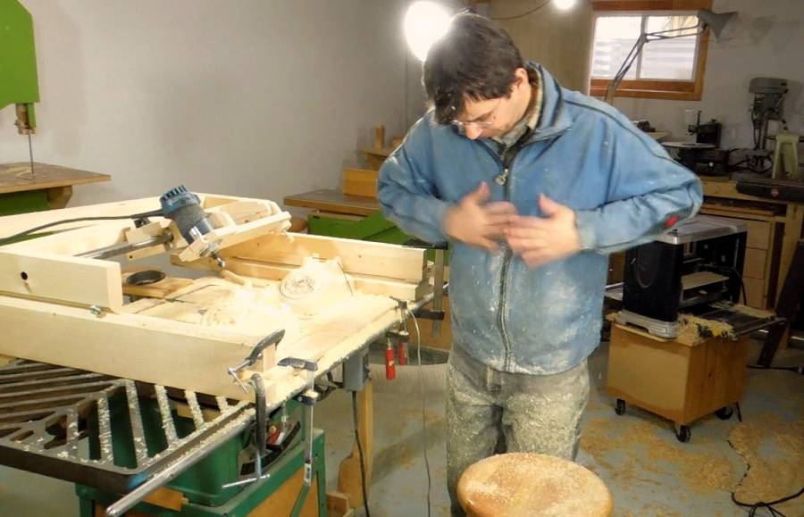 I sure got a lot of dust on myself, sitting in front of the router and working away. After that, I moved the dust collection hose and mounted it to the frame of the router copier so that the hose was always within about 20 cm of the router bit. That still wasn't enough to pull in all the dust, but it captured most of the finer airborne dust.