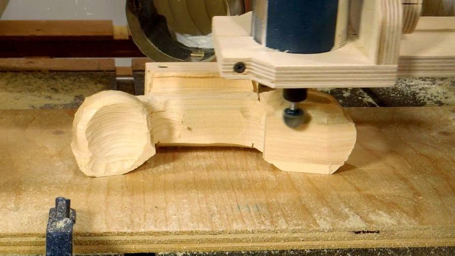 Checking the blank - I have to make sure the router always hits the blank before the follower hits the original. As it turned out, I had cut away a bit too much from my blank and had to glue a few bits of wood back on. Oops!