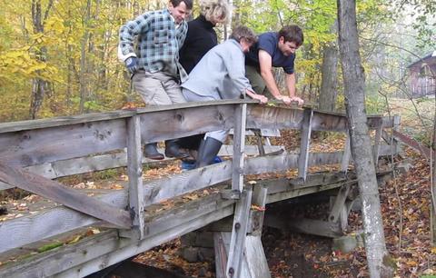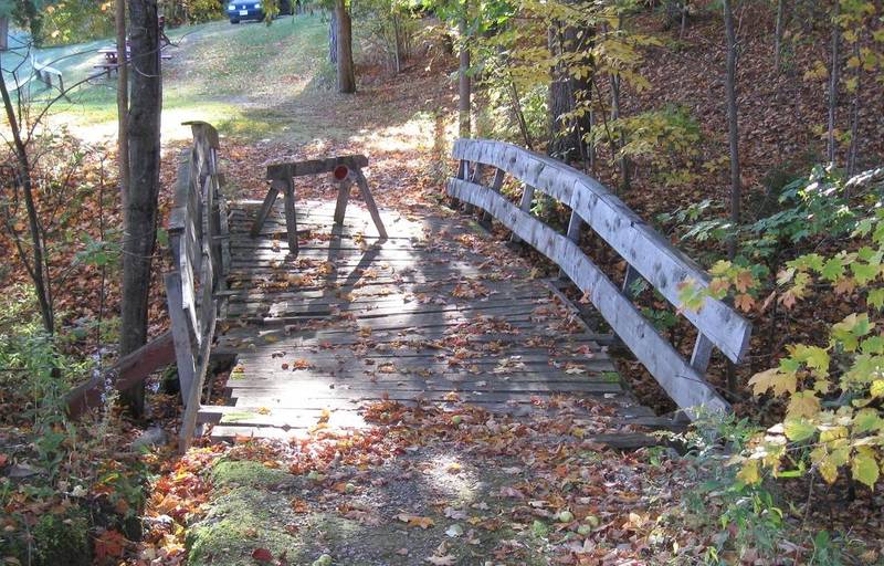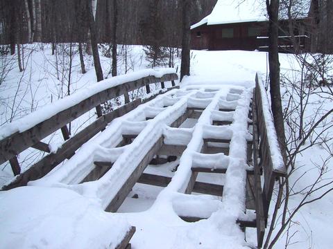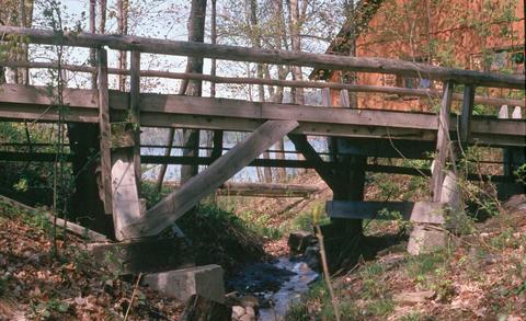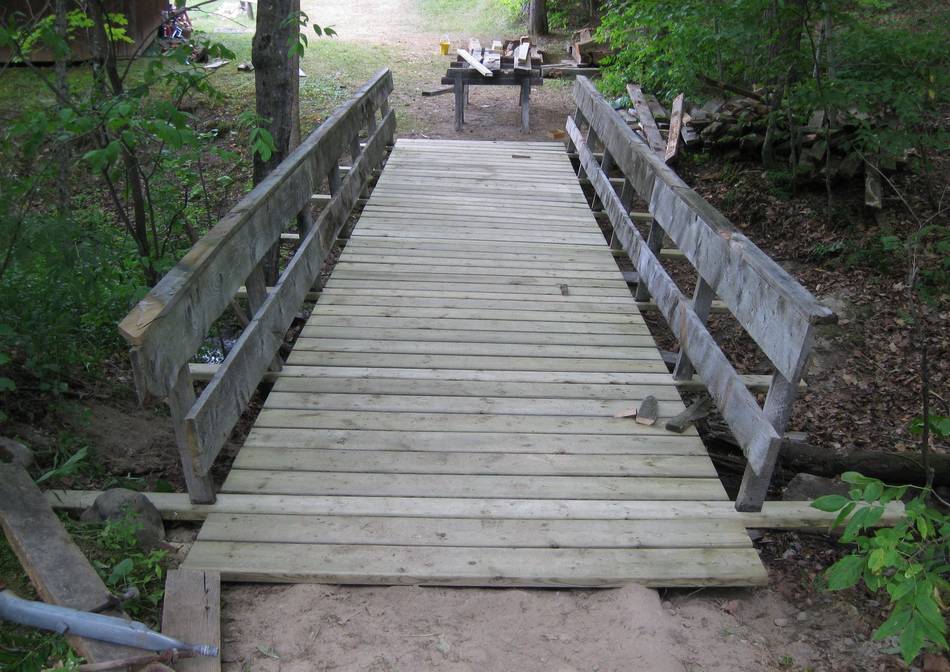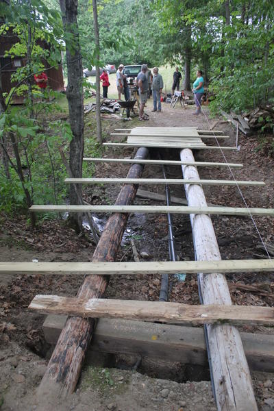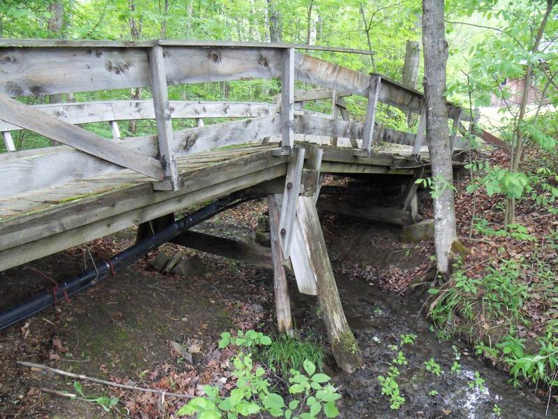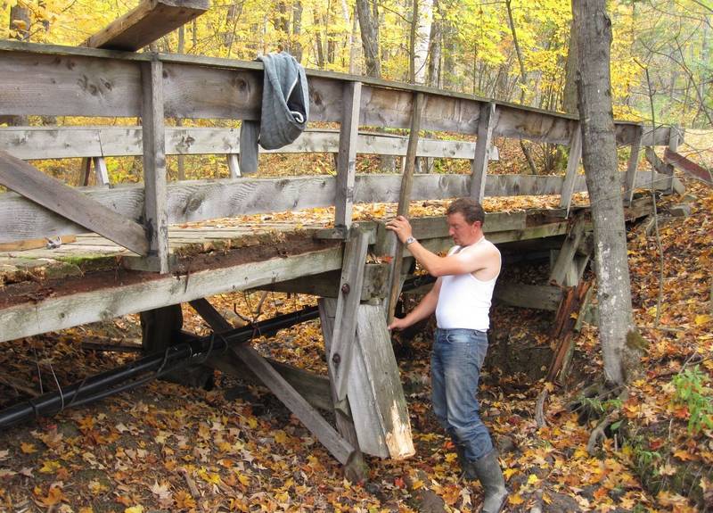 This strategy, it turned out, had very limited success. And with the waterlogged ground from the creek, the foundations shifted a lot. What kept the bridge usable over the years is that my dad propped up and moved the supports after every winter to keep the bridge reasonably straight.