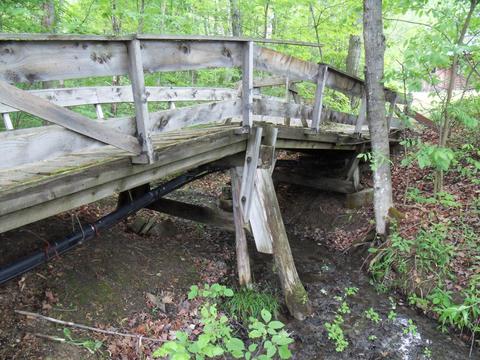 And so the bridge had developed a very serious kink to it, and the wood looked fairly rotten too. We figured we'd have to tear the bridge down. I had some ideas for how a simpler, shorter unsupported walking bridge could be constructed across the creek, but stairs would be needed to get down to the level of the creek, so it wouldn't be possible to drive the mower across it.