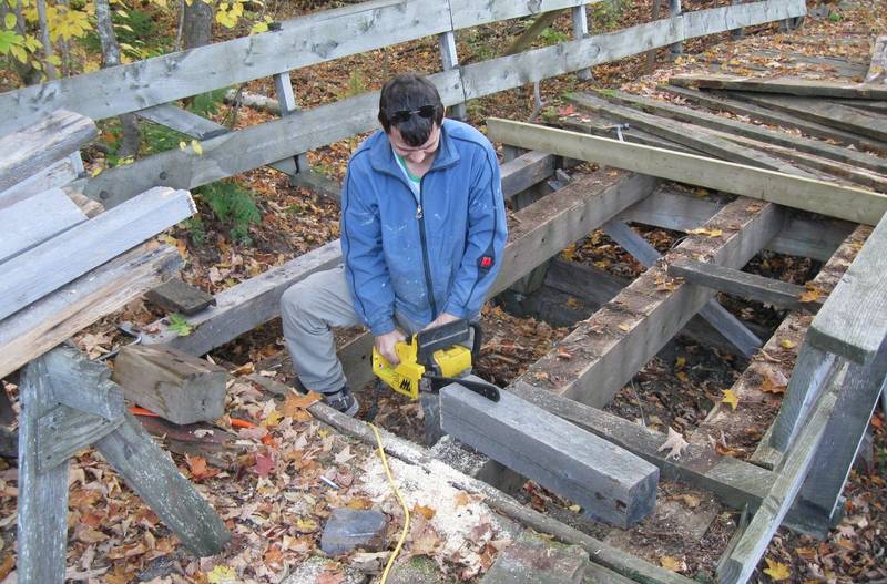One of my cousins working on boards for the decking. This board needed a notch cut into it