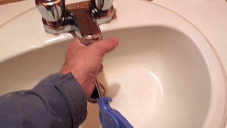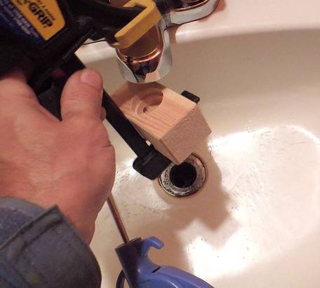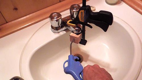 I made a fitting that clamps to the sink for injecting air, though, in a pinch, one could just hold the nozzle against the sink and cup the fingers around it. You wouldn't get a very good seal, but it would be enough to push the water out of the hot water tank.